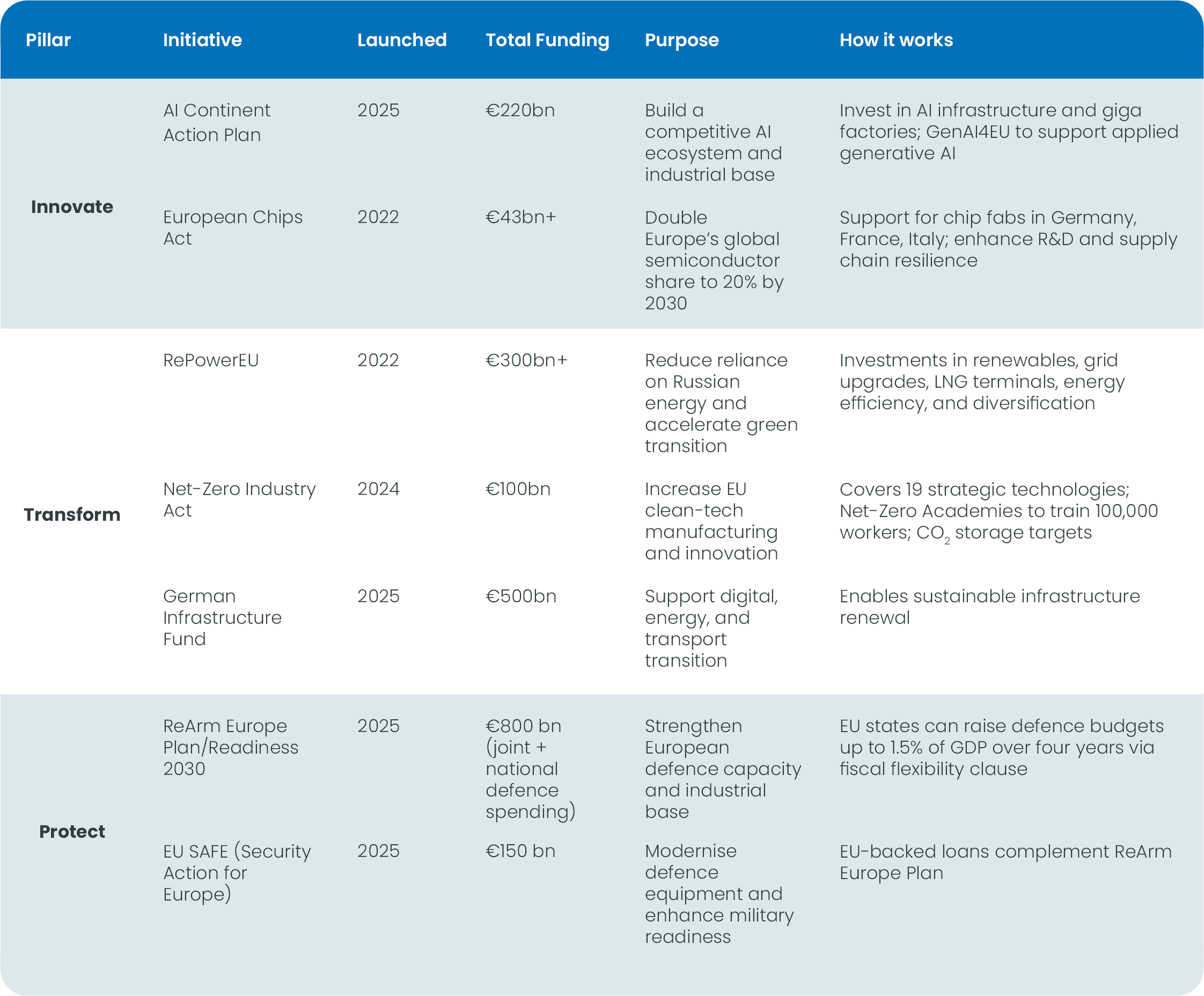 - Other initiatives (such as ReArm Europe and the Infrastructure Fund) remain in early stages of planning and mobilisation, with full implementation and large-scale spending still ahead. Nevertheless, progress is solid, with the €150 billion SAFE Plan already fully subscribed by 19 member states.[7]