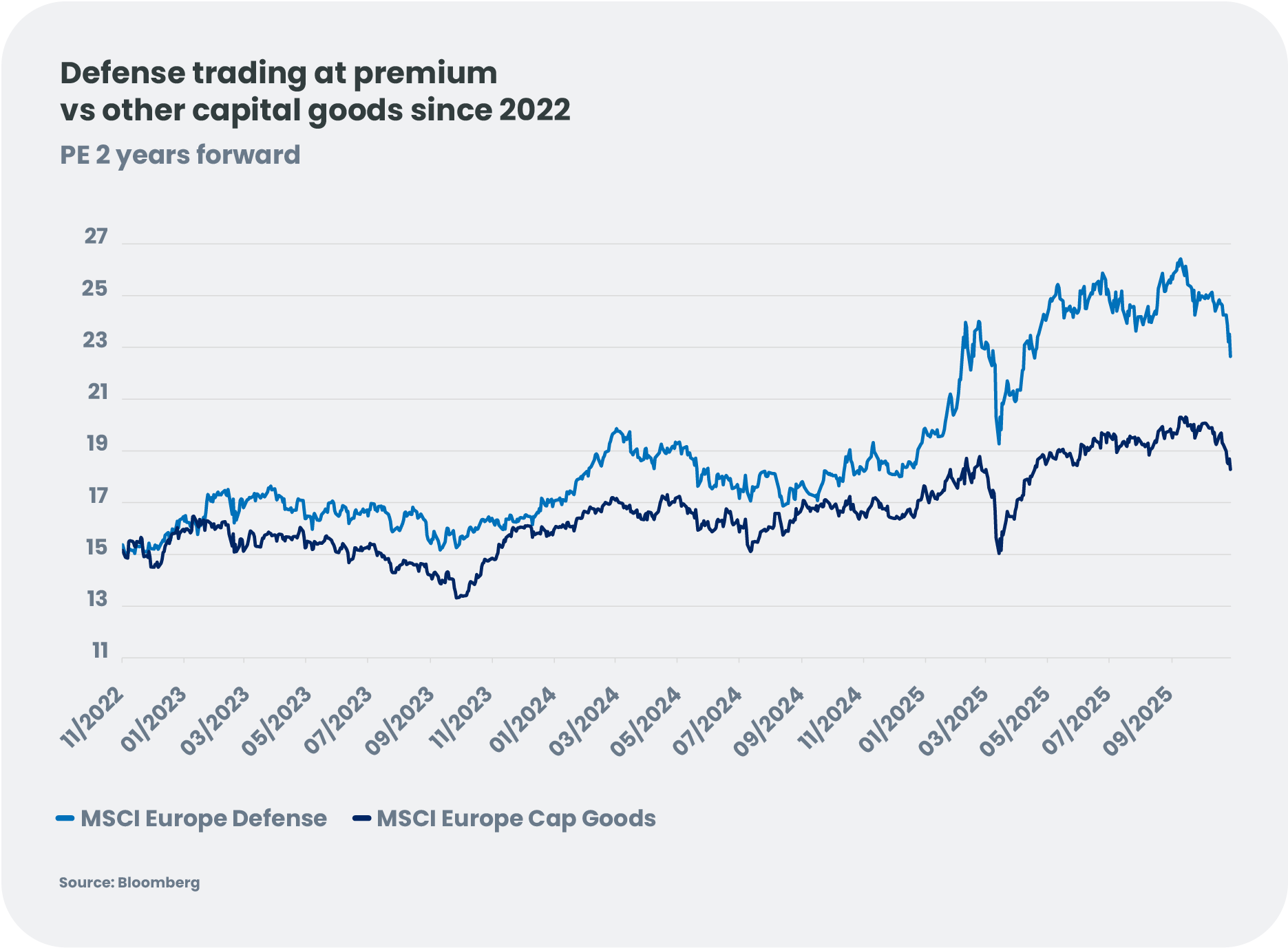 - Aerospace and defence: Valuation levels are normalising after strong performance and progress in Russia–Ukraine peace talks, creating new investment openings. Spending is expected to hold firm given the persistent Russian threat and the need to rebuild key capabilities. We favour exposure to German defence budgets and companies with promising valuation levels. We also monitor the shift toward long-cycle defence and upcoming IPOs.