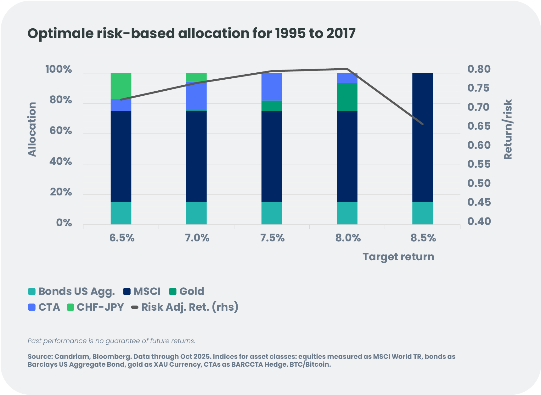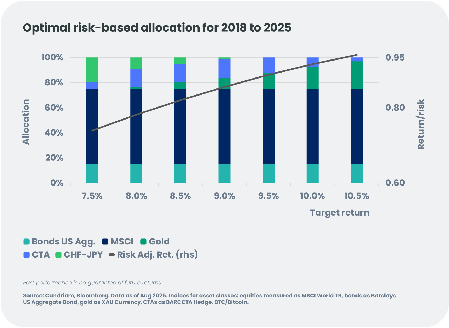 Optimisation exercises support this view: when performance targets are modest, the equity–bond combination is sufficient to reach the objective given the portfolio constraints, and the alternatives bucket remains naturally underused. Conversely, as higher returns are targeted, the gradual integration of gold and CTAs becomes essential to improve the risk–return profile.