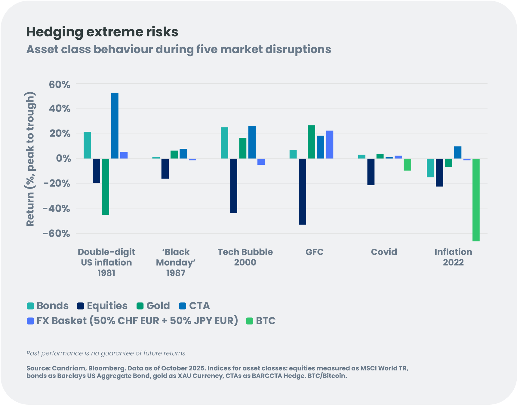 Bitcoin, sometimes called ‘digital gold’, benefits from its finite supply but remains above all an opportunistic asset, strongly dependent on liquidity conditions. CTA[1] strategies, for their part, can provide useful diversification, particularly in directional phases or during extreme shocks.