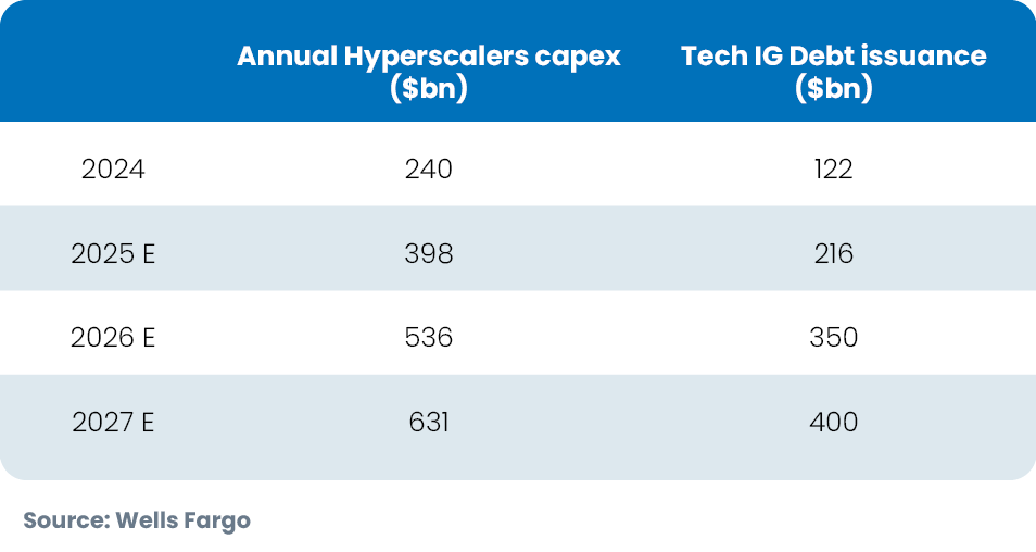 This trend is unlikely to fade. With AI infrastructure requirements still accelerating, the sector is poised to become a much larger component of IG indices. Over the coming year alone, additional issuance could exceed $150 billion[8] (or +60% YoY), driven primarily by the Big Five hyperscalers. While long-term fundamentals remain solid, we believe a slightly underweight and selectively positioned stance is prudent - particularly at the long end of the curve.