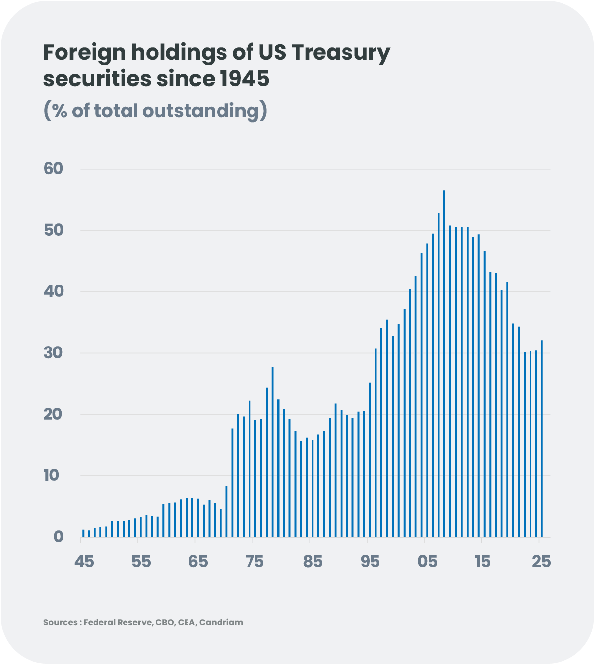 If the Fed's independence were to be called into question, we expect the dollar would be the most vulnerable asset. Among the factors likely to exacerbate this fragility is the currency hedging behaviour of international investors. This mechanism could be particularly effective in Europe, where the dollar exposure of some major pension funds remains close to the highs of the last decade. It should be noted that a weaker dollar would be in line with the wishes of the Trump administration and Stephan Miran, its emissary and now a Governor of the Fed. However, a sudden and steep decline would be less appreciated!