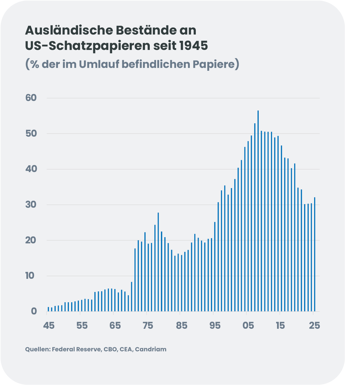 Gleichzeitig würde die von Michelle Bowman, der aktuellen Leiterin der Bankenaufsicht, bereits eingeleitete Lockerung der Kapitalbeschränkungen es den Banken erleichtern, Staatsanleihen aufzunehmen. Die Verwaltung könnte versucht sein, noch weiterzugehen, indem sie eine Steuerung der Renditekurve im Stil der 1940er Jahre einführt. Der Kontext ist allerdings nicht derselbe. Am Ende des Zweiten Weltkriegs wurden US-Anleihen fast vollständig von inländischen Anlegern gehalten, während heute fast 30% der Wertpapiere von Gebietsfremden gehalten werden. Ein Regime der „finanziellen Repression“ dürfte ihr Vertrauen zwangsläufig untergraben.