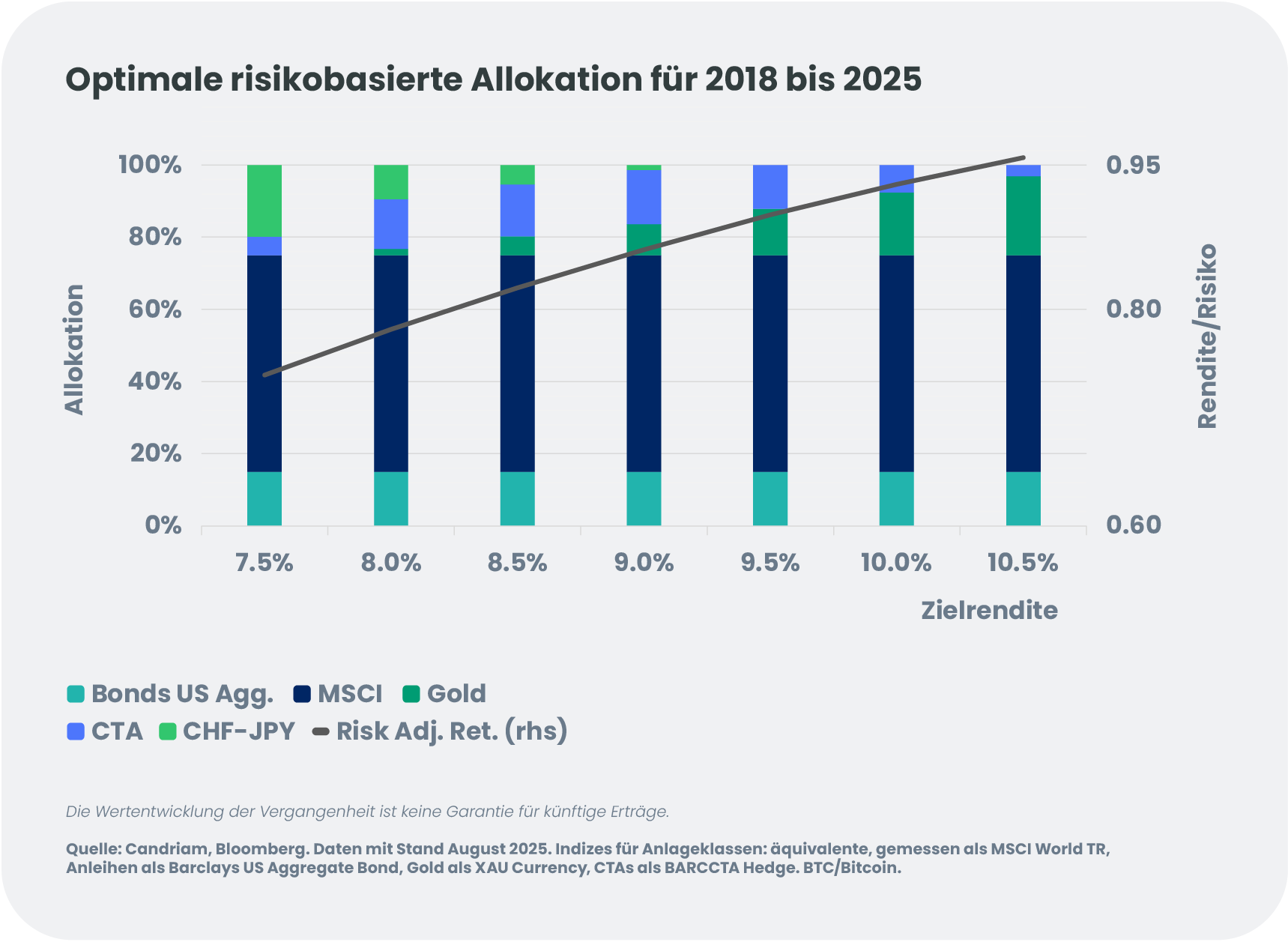 Optimierungsmaßnahmen untermauern diese Einschätzung: Bei moderaten Performancezielen reicht die Kombination aus Aktien und Anleihen angesichts der Portfoliovorgaben aus, um das Ziel zu erreichen, und alternative Anlagen bleiben naturgemäß unzureichend genutzt. Umgekehrt wird bei höheren Renditezielen die schrittweise Integration von Gold und CTAs unerlässlich, um das Risiko-Rendite-Profil zu verbessern.