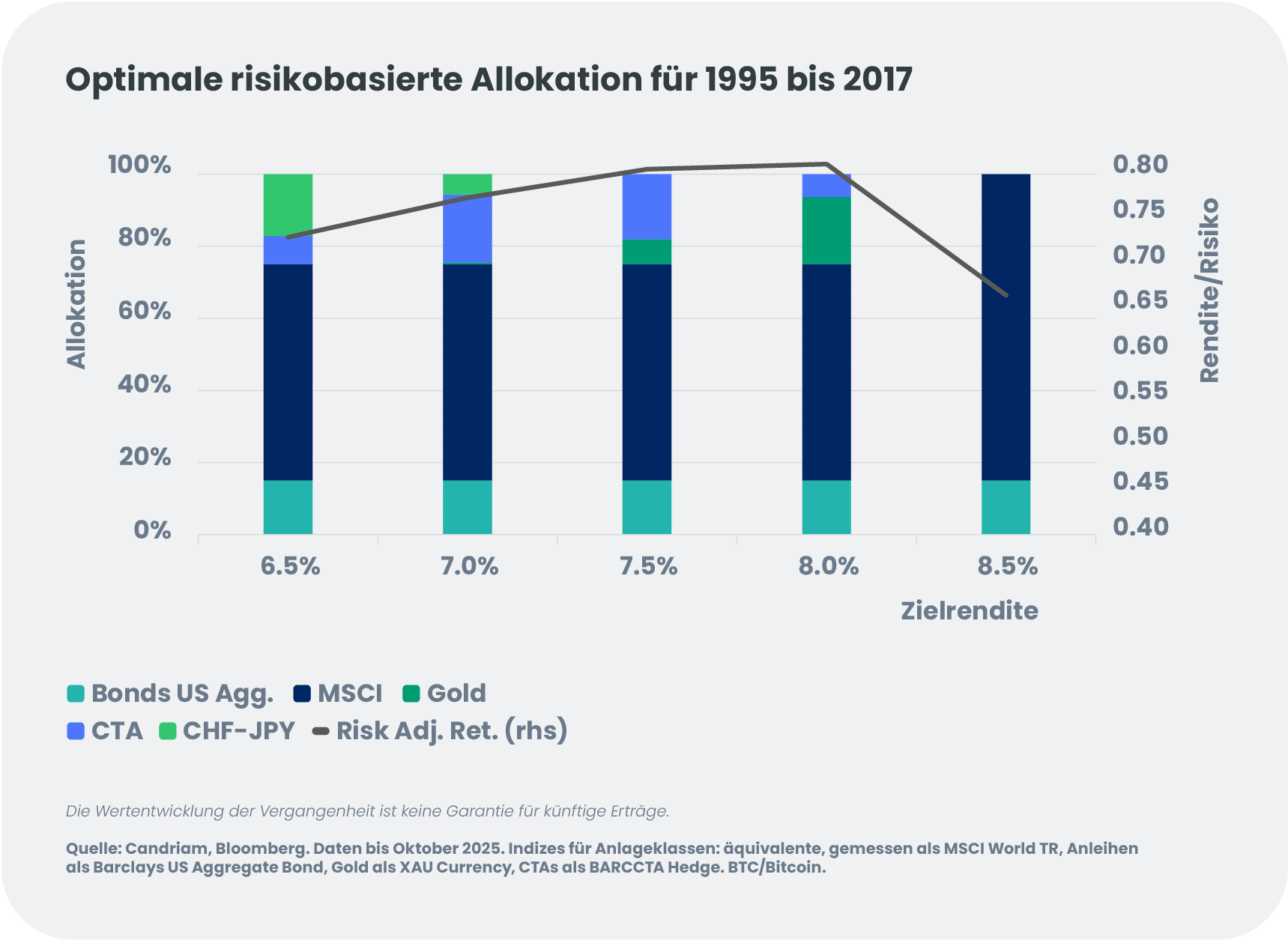 Zwischen 1995 und 2017, einer Zeit, in der die Korrelation zwischen Aktien und Anleihen generell negativ und die Realzinsen positiv waren, tauchte Gold bereits in optimierten Portfolios auf, allerdings eher opportunistisch. CTAs ergänzten die Diversifizierung, während sichere Währungen weiterhin eine untergeordnete Rolle spielten.