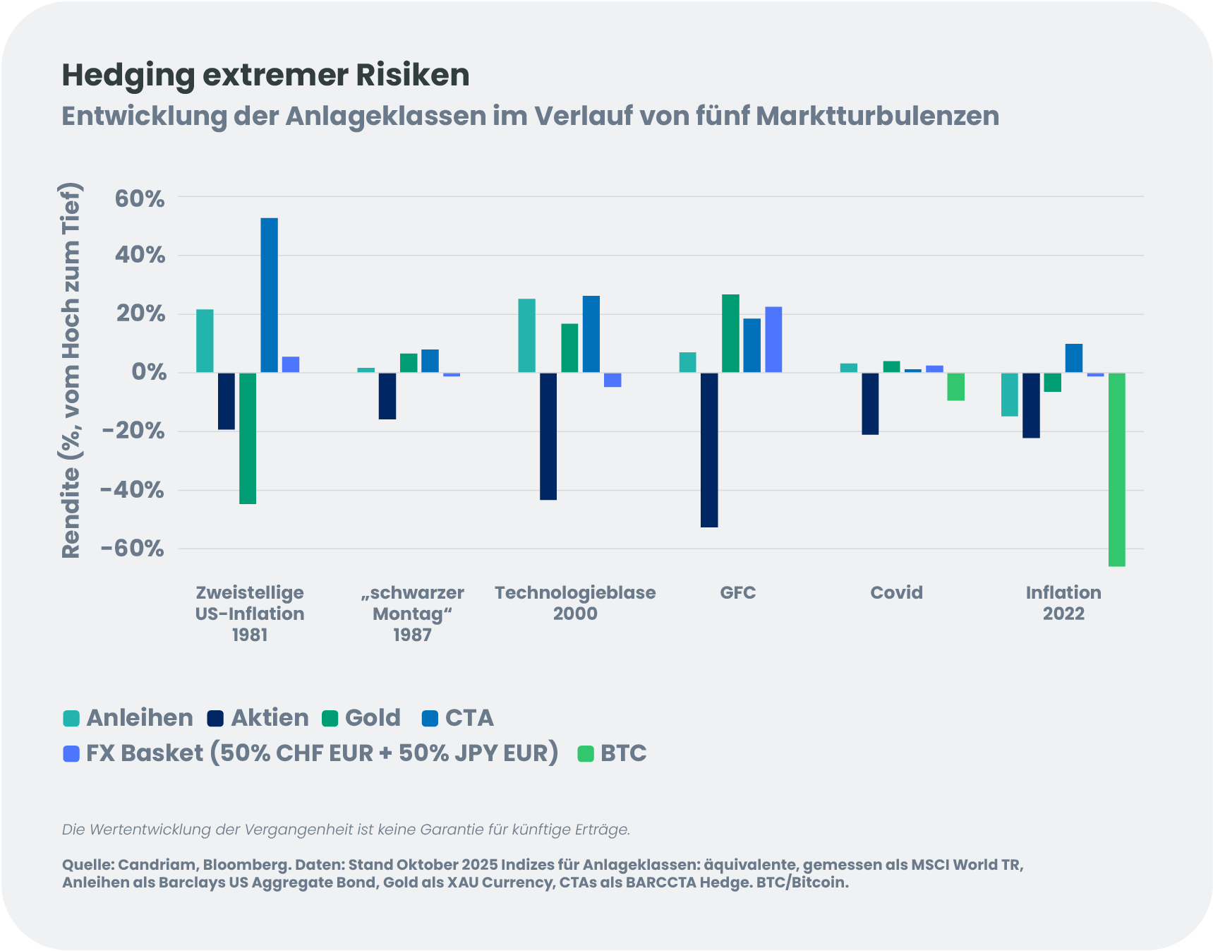 Anlagen, die traditionell als Save Havens gelten, haben unterschiedliche Entwicklungen genommen. Staatsanleihen, die lange Zeit als natürliche Stoßdämpfer fungierten, haben mit der Rückkehr der Inflation und anhaltenden geopolitischen Spannungen an Diversifizierungskraft verloren. Der US-Dollar spielt weiterhin eine zentrale Rolle, aber der anhaltende Kurs des Haushaltsdefizits in den USA und die allmähliche Diversifizierung der Anleger weg vom Dollar schwächen seine Stabilität weiter. Der Schweizer Franken und der Yen bleiben Notfallwährungen, aber ihre Wirksamkeit als Diversifikatoren hängt stark von geldpolitischen Entscheidungen im Inland ab.