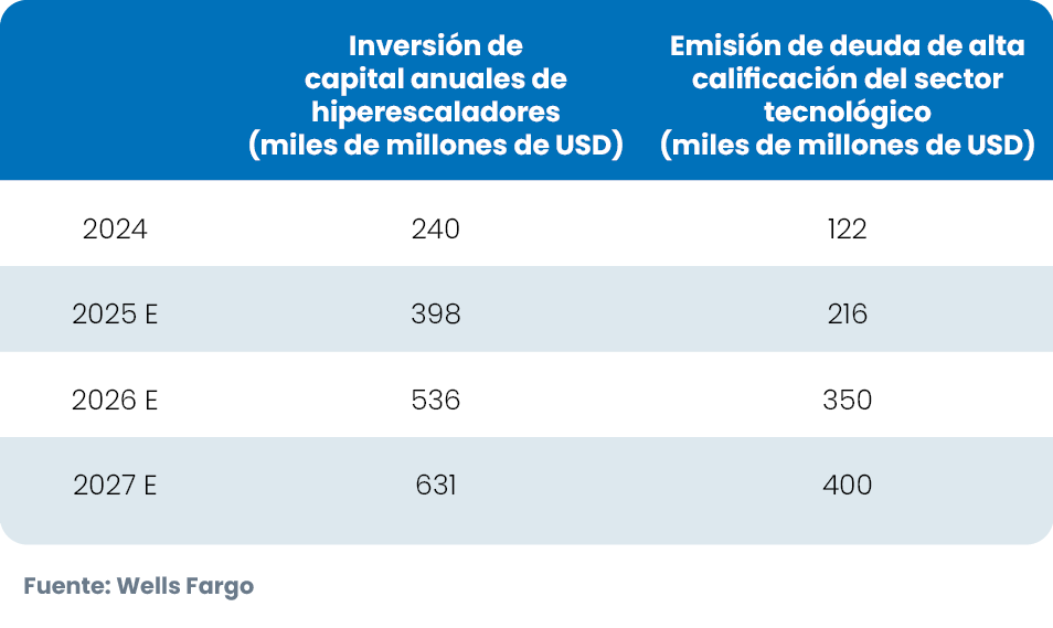 La aceleración de la inversión en IA está transformando no solo los sectores, sino también los mercados de crédito mundiales. Las necesidades de inversión en bienes de equipo superan ahora lo que muchas empresas tecnológicas pueden financiar a través del flujo de efectivo, lo que empuja al ecosistema de la IA a depender más de la deuda.