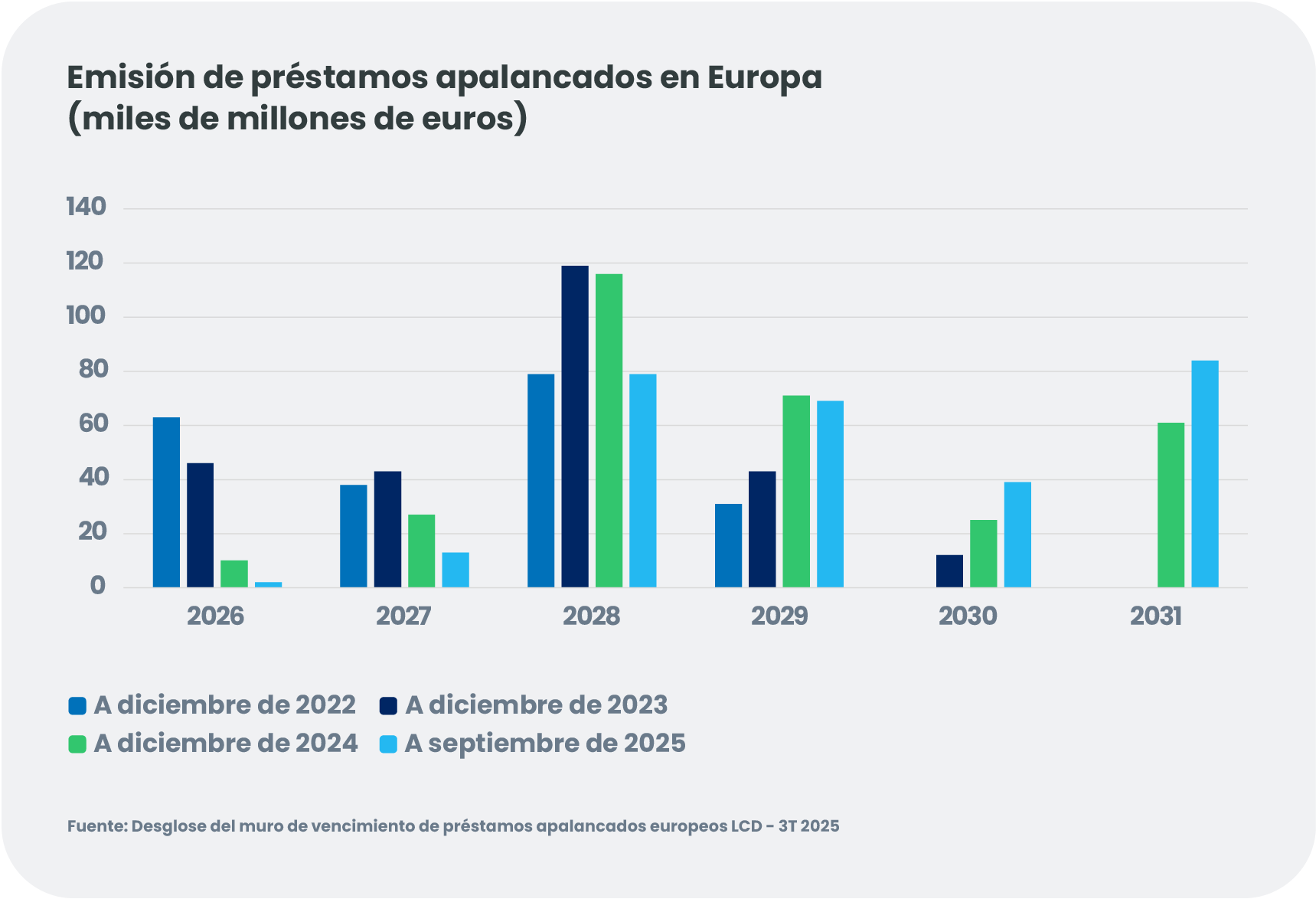 Los volúmenes récord de refinanciación en 2024 —los más elevados en siete años para los préstamos apalancados— han desplazado el muro de vencimientos a 2028.