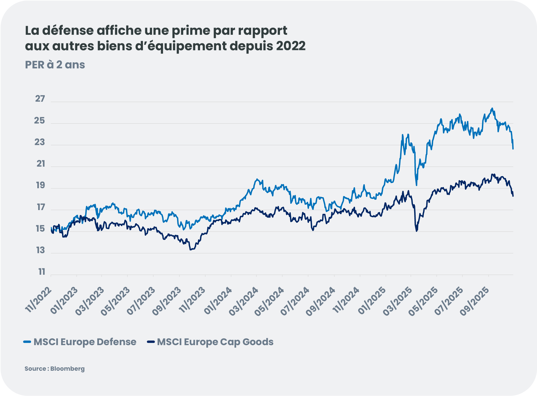 En particulier, les valeurs exposées à l’Allemagne et celles du secteur aéronautique et de la défense (A&D) se sont fortement appréciées. Les entreprises ne sont pas bon marché à l’aune des multiples actuels, mais le secteur de l’A&D demeure relativement sous-détenu[8], ce qui, associé à l’accélération de la croissance du chiffre d’affaires et du BPA, impose de s’y intéresser et laisse entrevoir une marge de hausse supplémentaire. Au total, le secteur de l’A&D représente 5 % de l’indice MSCI Europe (contre 2,75 % il y a deux ans).