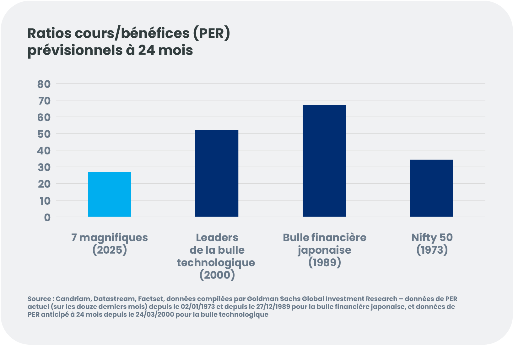 L’IA représente surtout une source de revenus récurrents, et non ponctuels. Chaque requête, mise à jour de modèle et action d’un agent consomme de la puissance de calcul, soutenant ainsi une demande durable pour les infrastructures et les services Cloud. Pourtant, malgré la solide performance des actions, les valorisations au sein de l’écosystème de l’IA sont bien plus raisonnables que celles observées lors de la bulle internet ou d’autres bulles de l’histoire financière, et les bilans sont nettement plus sains.