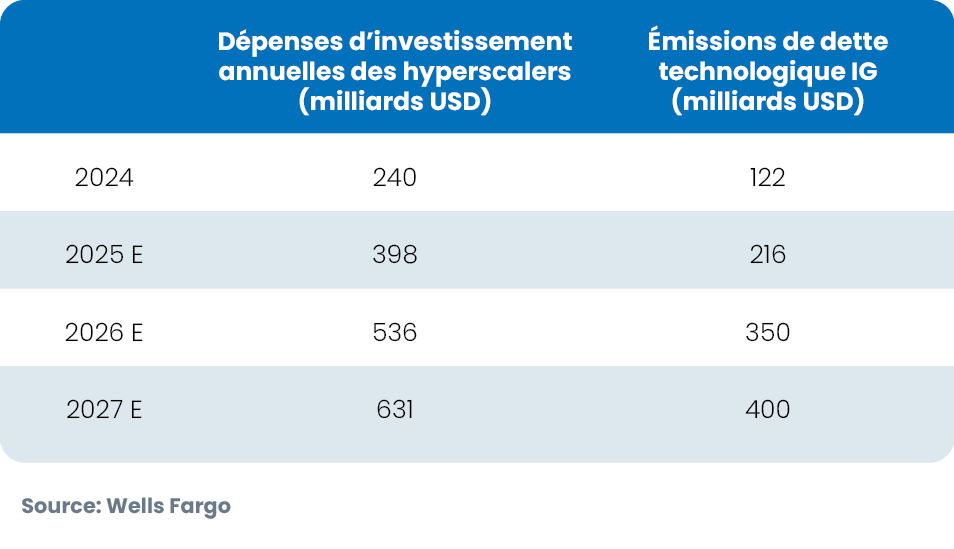 Les hyperscalers américains ont émis une vague d’obligations de taille record pour soutenir l’expansion de leurs infrastructures. Si des bilans solides ont jusqu’ici soutenu la demande, l’environnement évolue : des coupons plus élevés, des performances plus faibles sur le marché secondaire et un élargissement des spreads reflètent les inquiétudes des investisseurs face à la hausse de l’endettement et aux plans de dépenses pluriannuels. Les émissions cumulées ont déjà dépassé les 120 milliards de dollars.[7].