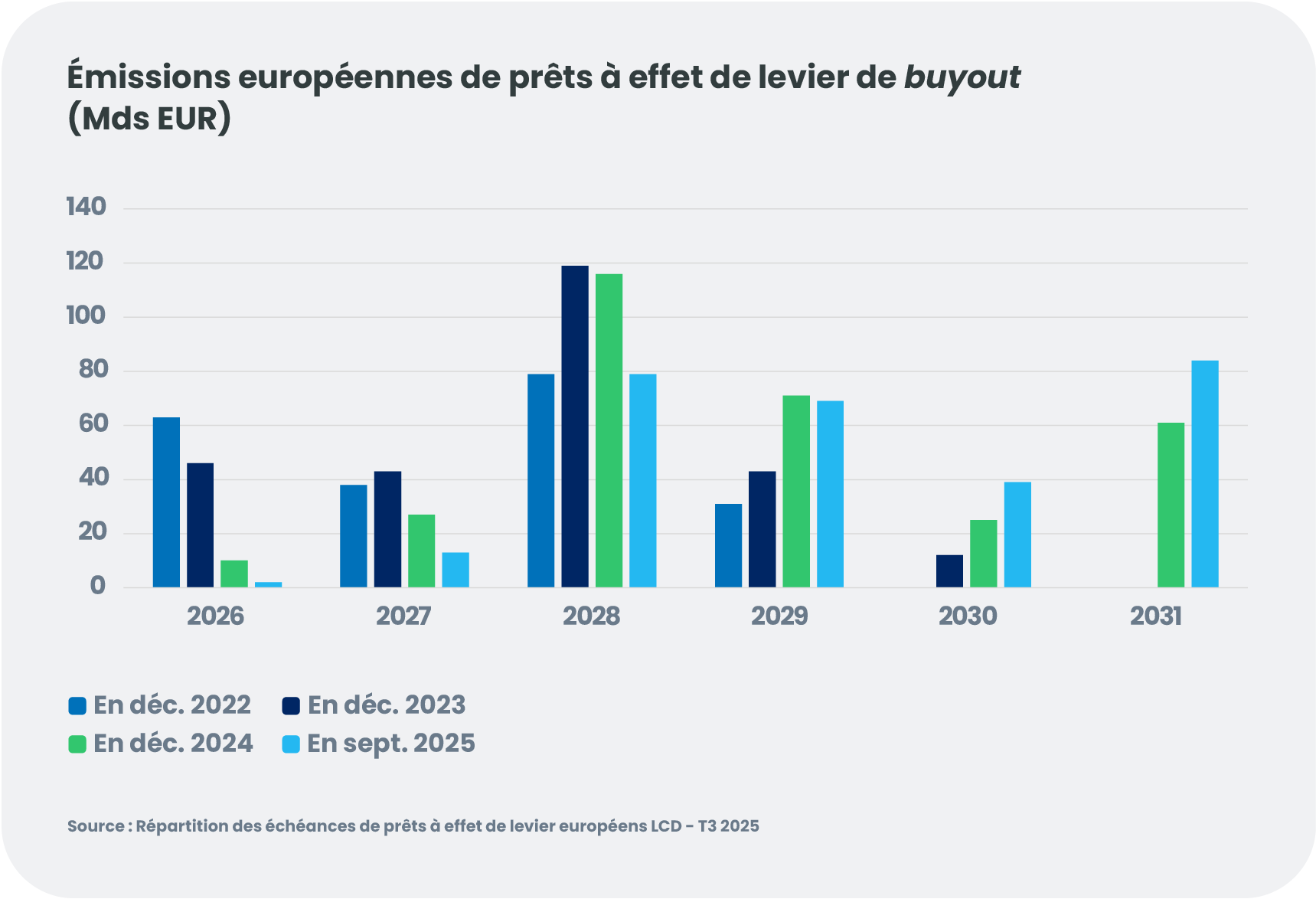 Les volumes de refinancement record observés en 2024 –les plus élevés depuis sept ans pour les prêts à effet de levier – ont repoussé le mur de maturité à 2028.