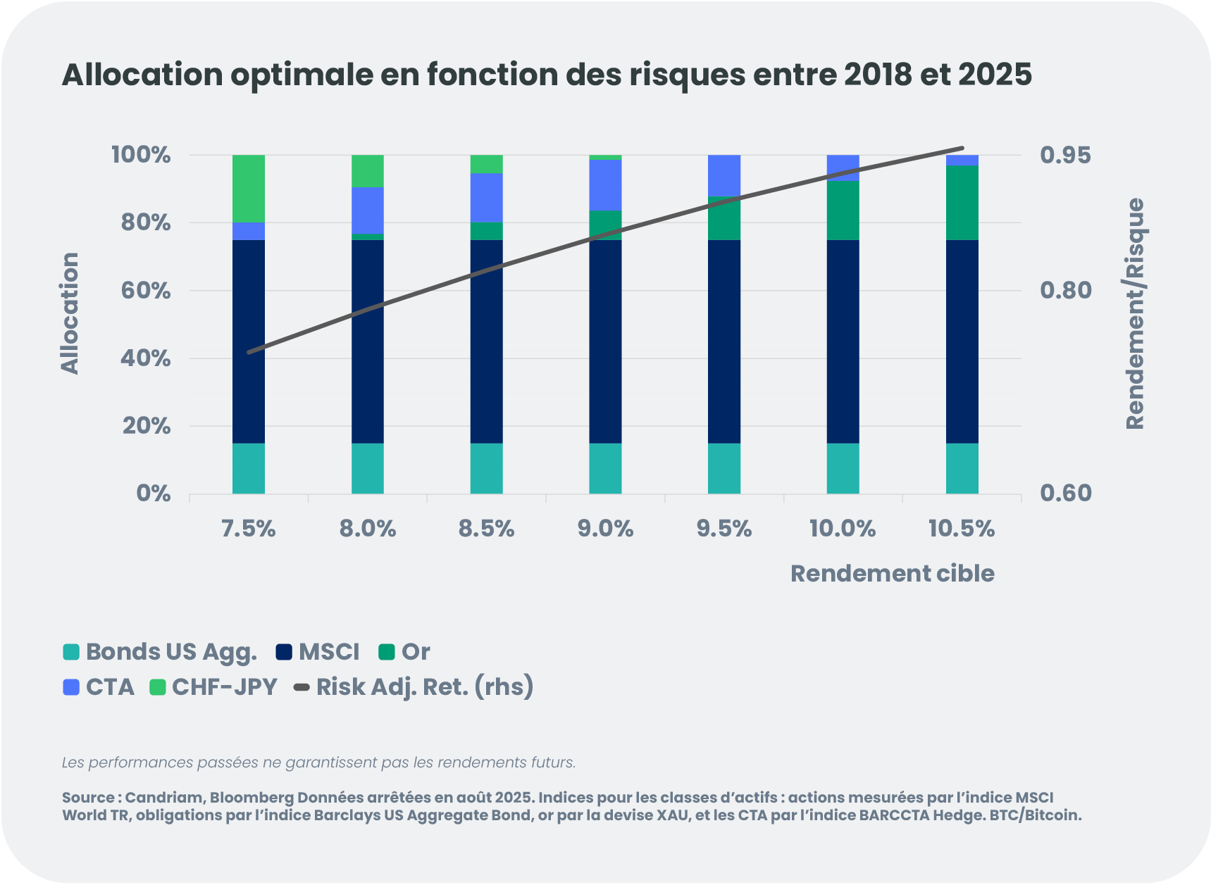 Depuis 2018, le changement de régime macroéconomique a conduit les portefeuilles optimisés à recourir plus fréquemment à la poche d’actifs alternatifs. L’or a pris une importance croissante, avec des allocations optimales dépassant les 20 % selon les objectifs de performance, attestant de sa contribution accrue au profil rendement-risque. Les CTA complètent ce bloc, tandis que le rôle des devises refuges s’affaiblit.
