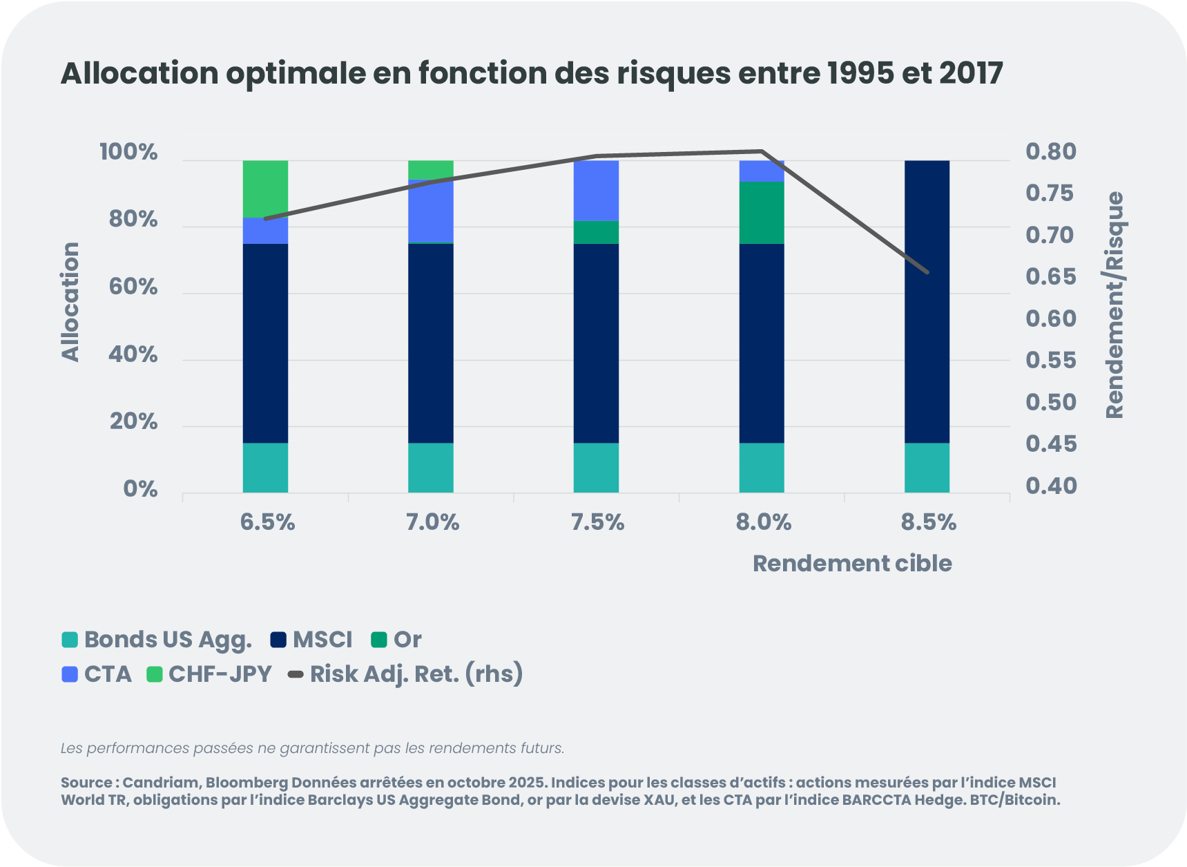Entre 1995 et 2017, période caractérisée par une corrélation actions-obligations généralement négative et des taux réels positifs, l’or était déjà présent dans les portefeuilles optimaux, mais de manière opportuniste. Les stratégies CTA complétaient la diversification, tandis que les devises refuges restaient secondaires.
