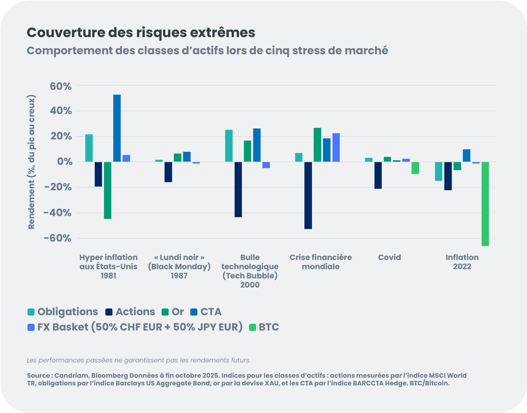 Le bitcoin, parfois qualifié d’« or numérique », bénéficie de son offre finie mais demeure avant tout un actif opportuniste, fortement dépendant des conditions de liquidité. Les stratégies CTA[1] peuvent, quant à elles, apporter une diversification utile, notamment dans des phases directionnelles ou lors de chocs extrêmes.