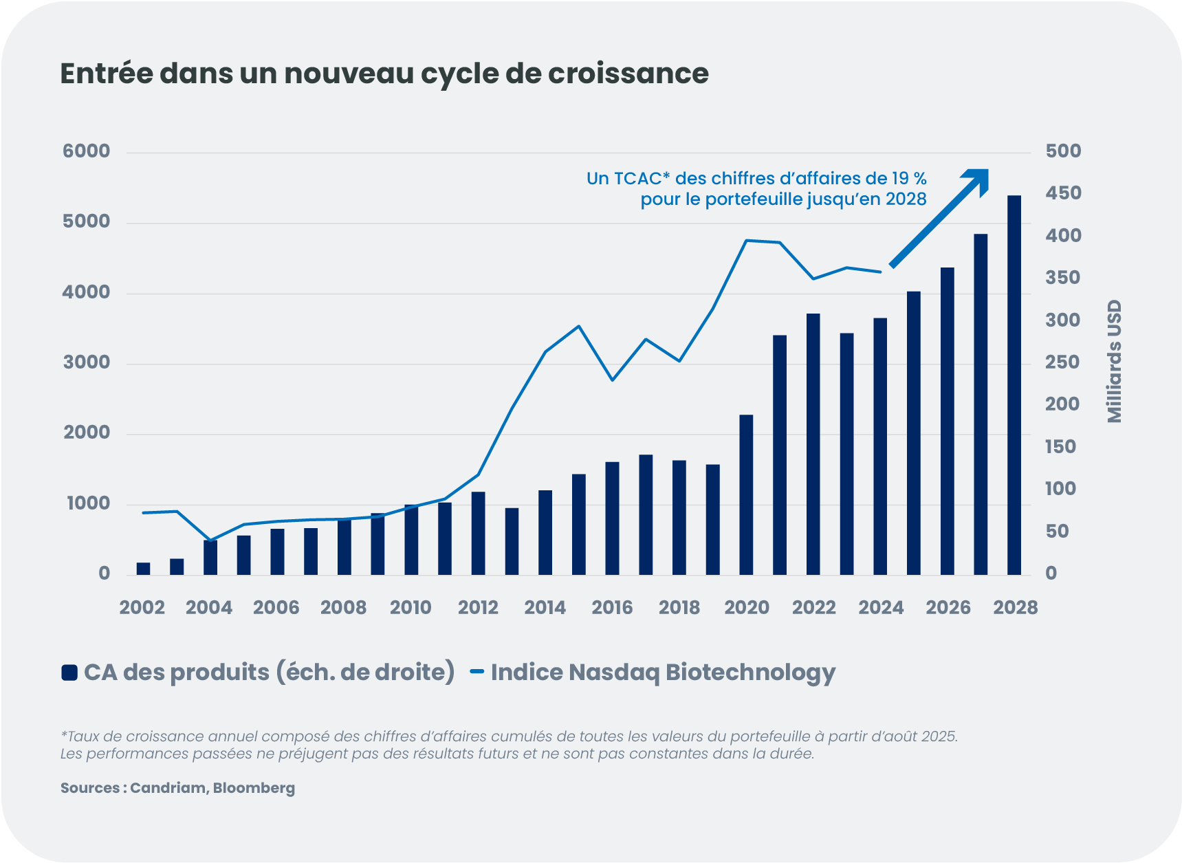 La biotechnologie s’impose comme l’un des rares secteurs capables de générer une croissance du chiffre d’affaires à deux chiffres largement indépendante du cycle économique. Avec de nombreux lancements de produits encore en phase initiale, une accélération des M&A et un cadre sectoriel structurellement renforcé, nous pensons que le secteur est bien positionné pour enregistrer des performances durables dans les années à venir.