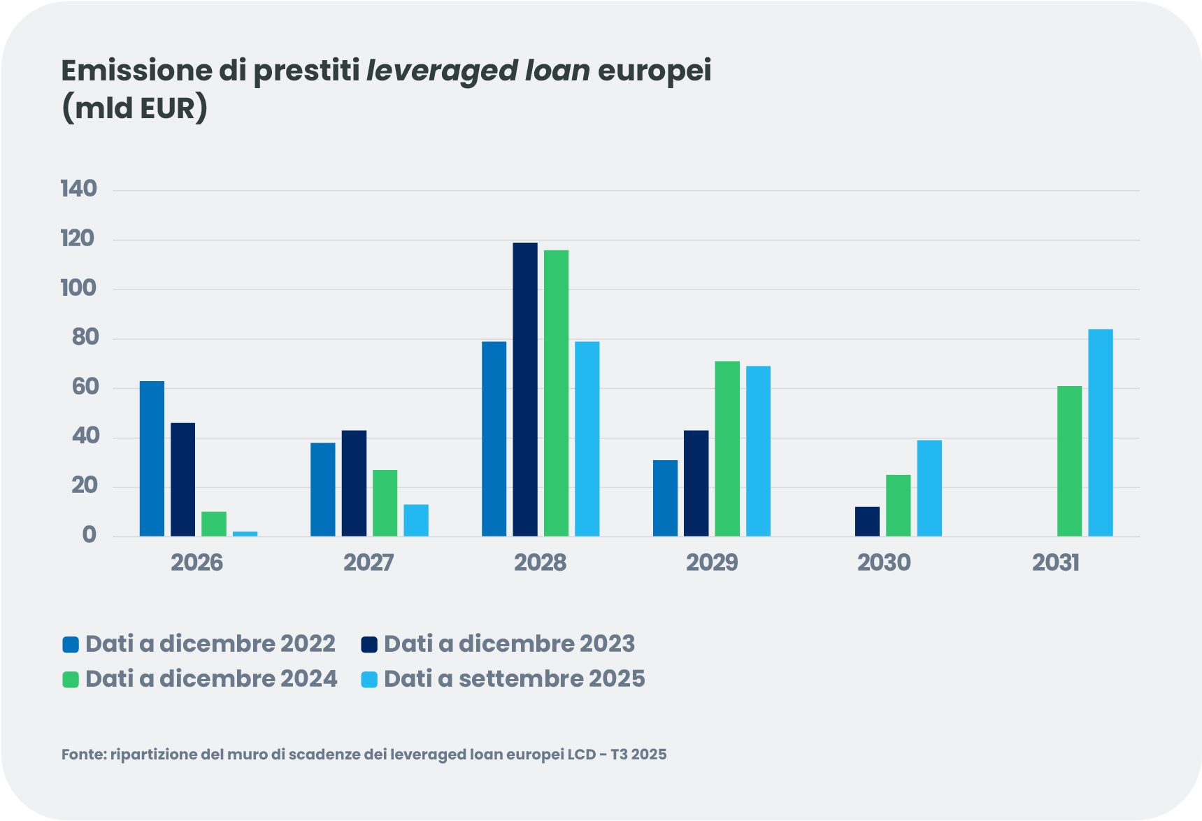 I volumi record di rifinanziamento nel 2024 (i più alti degli ultimi sette anni per i leveraged loan) hanno riportato la concentrazione delle scadenze al 2028.